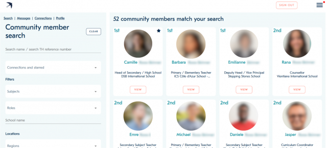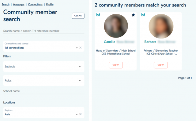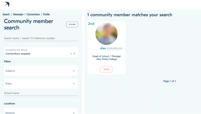Go to the ‘Member Search’ page via ‘Member search’ or ‘Our network’ options in the hamburger menu (icon on top right with three lines). You can also access the member search page by clicking ‘Search’ in the Community Networking menu on the top left. By default, no filters are selected and you will see all community members in the Teacher Horizons network. Choose filters to focus your search. By default, the search results are sorted by your starred, 1st connections, 2nd connections and then the rest of the community members. To view a member’s profile, click ‘view’ and that will open their full profile. The details visible will be based on both your and the member’s settings.