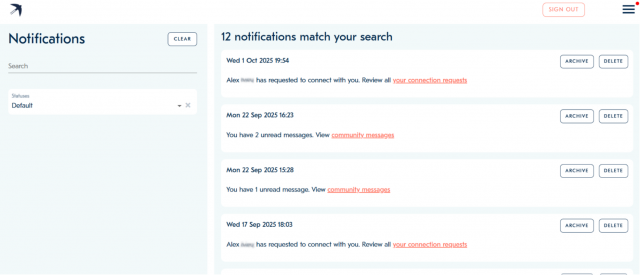 To view your notifications, click on ‘Notifications’ in the hamburger menu. On this page, you can view all your notifications. Each notification will have relevant links such as ‘Review all your connection requests’ or ‘View community messages’.