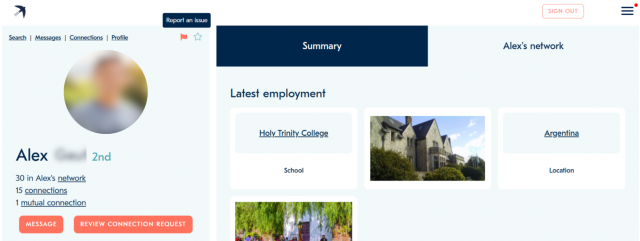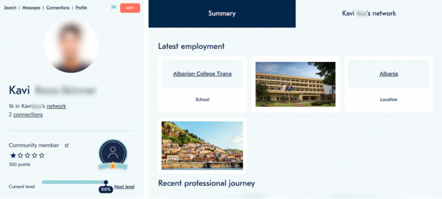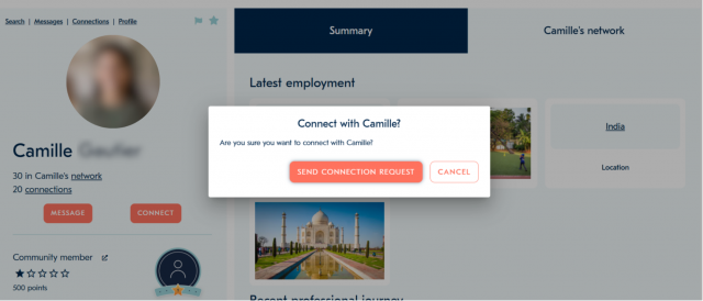 Community member profiles have two tabs: summary and network. Summary shows all their information and network shows community members in their network. The connection level on the member cards on this page is relative to your connection level with these members.