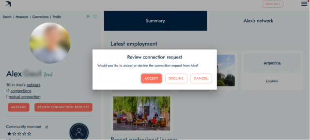 A 1st connection is someone you are directly connected to. This can be achieved by either member sending a connection request and the other member accepting it. 1st connections can see all of your community profile information (but not your ‘candidate profile’ info), irrespective of your community settings. (unless you choose ‘no access’). 1st connections can message you and you can message them.