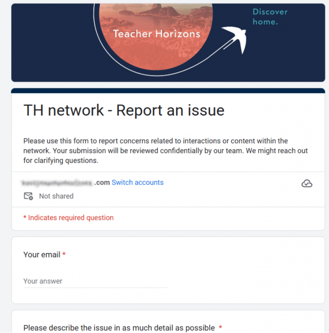 If you would like to report an issue related to using the Community Networking feature, whether it is related to another community member or not, you can do so by clicking on the flag icon in the top right corner of the left side of the page. This will lead you to a simple google form where you can explain your issue.