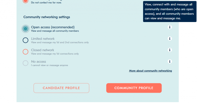 There are different settings available for you that will determine how you interact with the network. The table below has details of all the different settings. We recommend choosing ‘open’ settings to make the most of the network and build connections and interact with other community members.